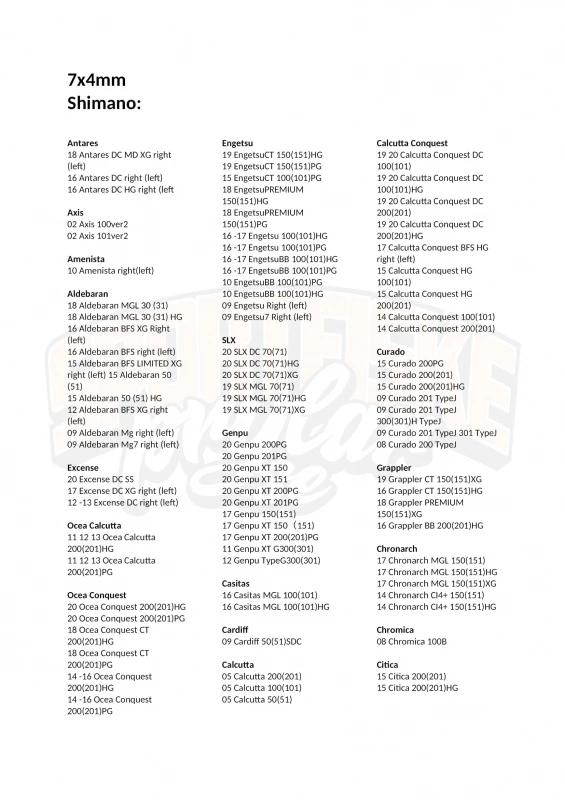 Antares, Axis, Amenista, Aldebaran, Excense, Ocea Calcutta, Ocea Conquest, Engetsu, SLX, Genpu, Casitas, Cardiff, Calcutta, Calcutta Conquest, Curado, Grappler, Chronarch, Chromica, Citica, Scorpion, Speedmaster, Salty One, Stile, Bass Rise, Bass One, Bantam, Brenious, Barchetta, Baygame, Metanium, Seihakou,