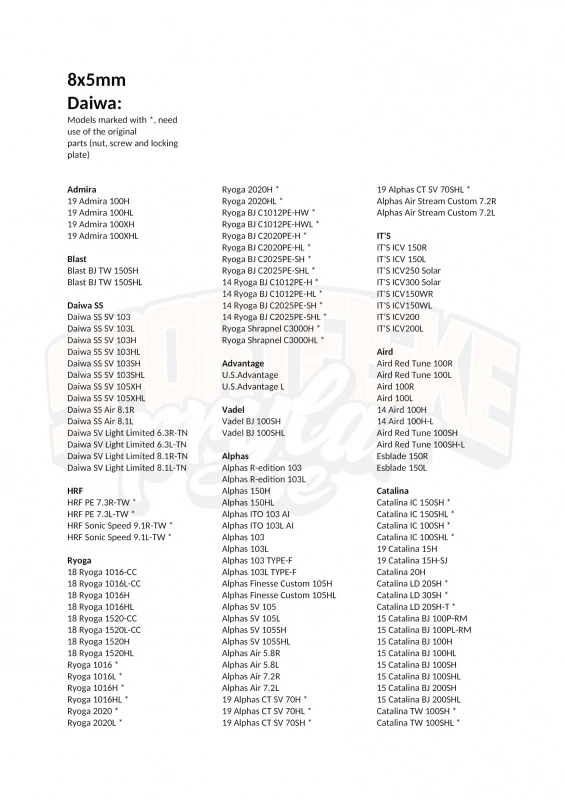 | Select | Daiwa, Abu Garcia, Quantum, Shimano (8x5mm), Shimano, 13 Fishing (7x4mm) |